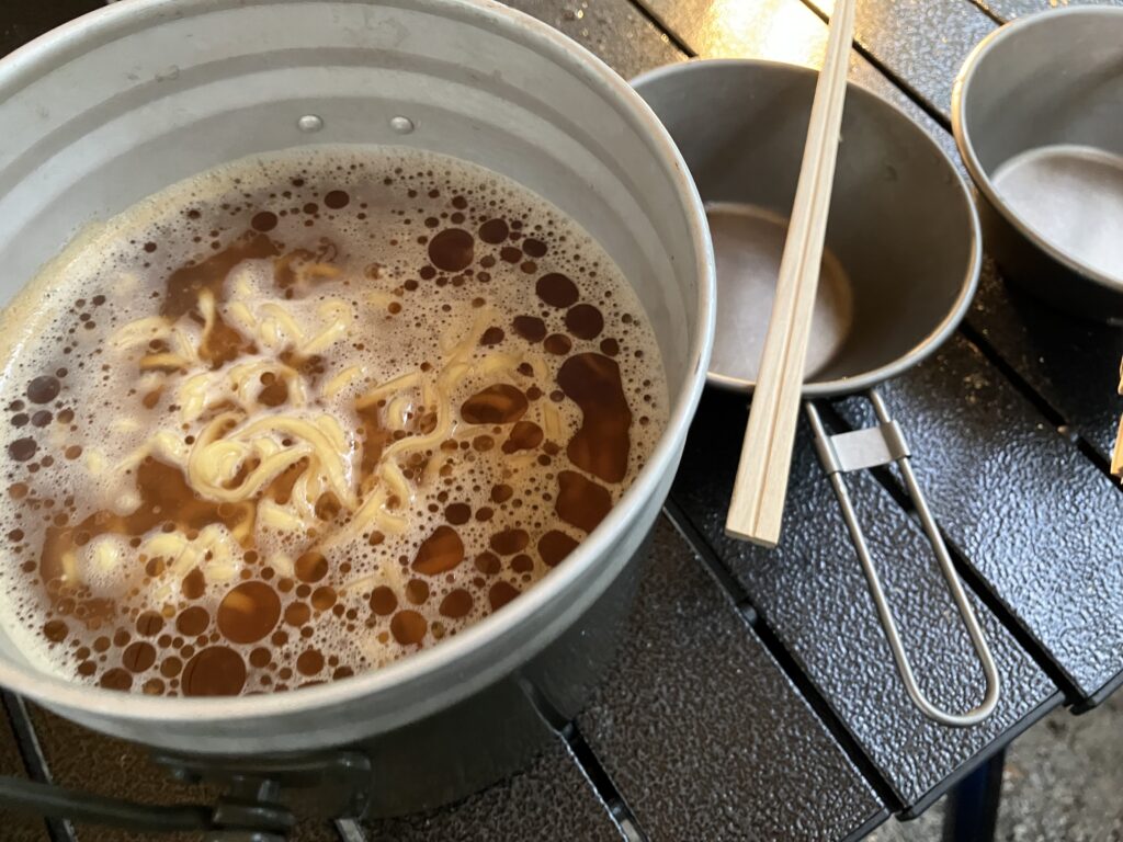 そして真っ暗闇の中、ランタンの灯りを頼りにサイトへ徒歩移動。遅めの夕食。