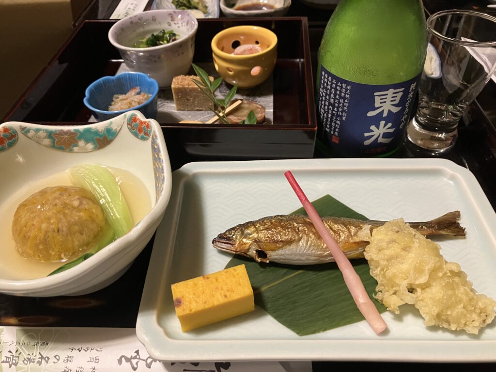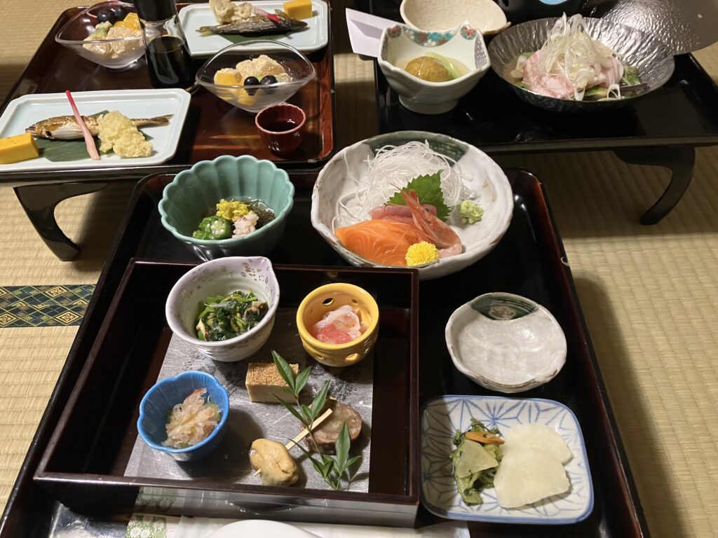 入浴後は夕食。お膳が部屋の外まで運ばれてきて、廊下から自分の部屋に移動させる方式。