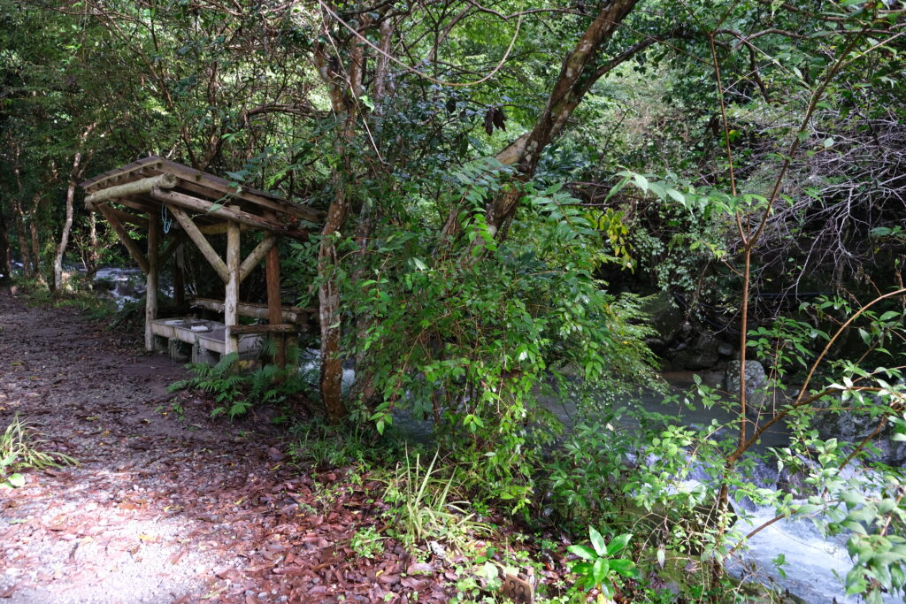 河津七滝オートキャンプ場には「嵐の湯」が楽しめる嵐の湯本館が併設されていて、その入口でキャンプの受付をする。サイトはすのこが敷かれたオートサイトAもあるが、私たちは車中泊でタープを張ることを伝えてあったので、川沿いに位置し、すのこが敷かれていないオートサイトBを案内してもらった。