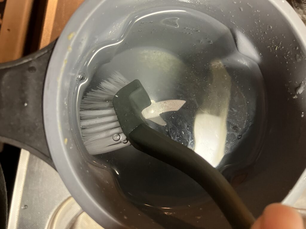しかし、調理後すぐ給湯器を高温(60℃)にして、すすぎ洗い+JUICE&CLEANモードをかければ、大体の汚れが落ちてくれる。油分や粘性が高いスープで汚れが残った時は、気になる箇所をブラシでこすればOK。