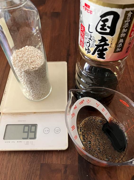 しょうゆはその同量の100㏄を加える。瓶で計量もできるのだが、米麹を袋に入れ替えて、また瓶に入れるのが面倒で計量カップを活用。OXO(オクソー)の計量カップは上から見ても分量がわかるので便利(↑)。
