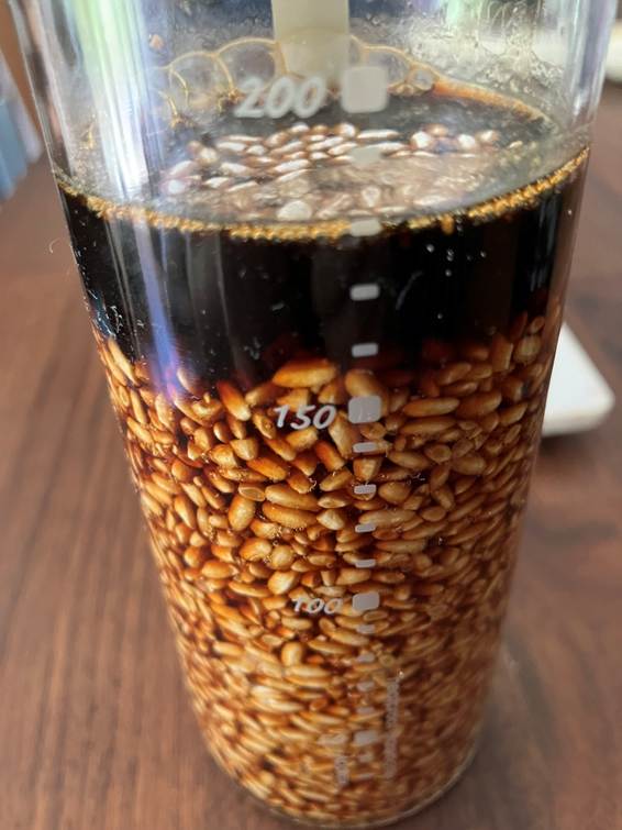 醤油を瓶に入れてみたら、これくらいの量に。今後は米麹の分量から3メモリくらい上に醤油を注げばいいのかな。