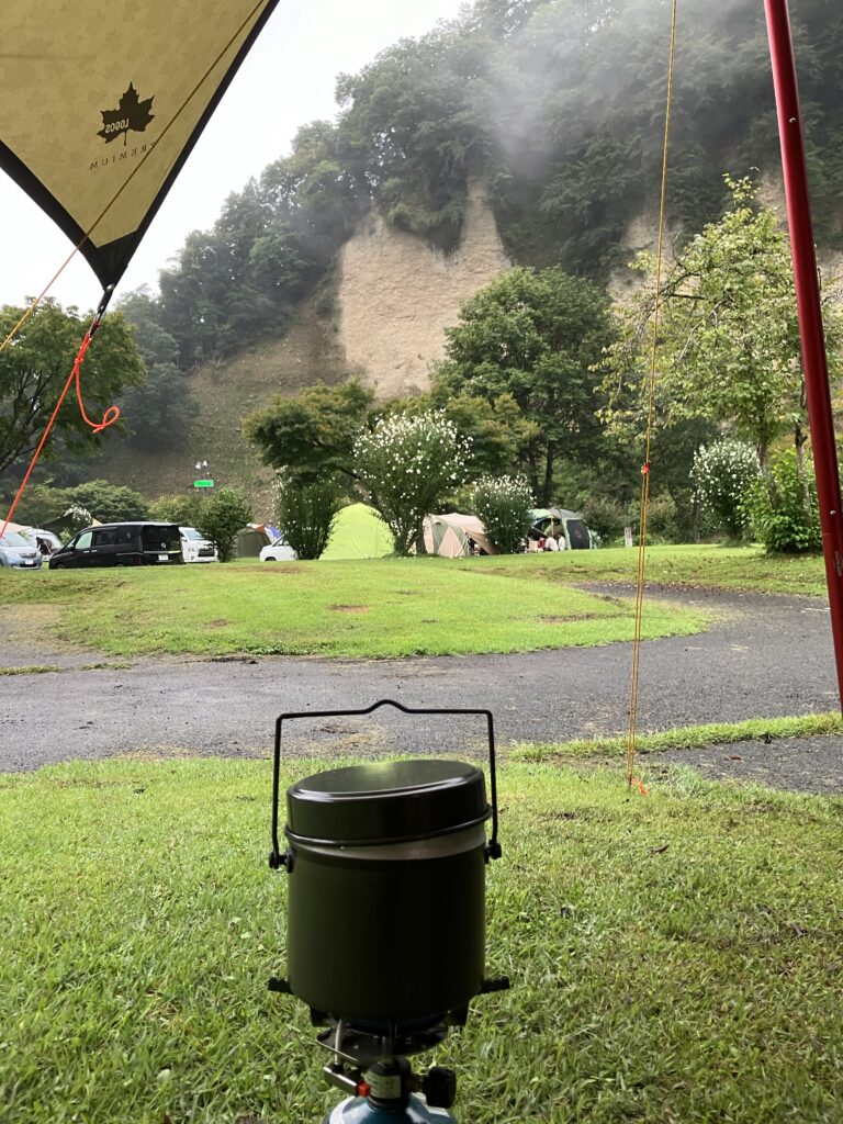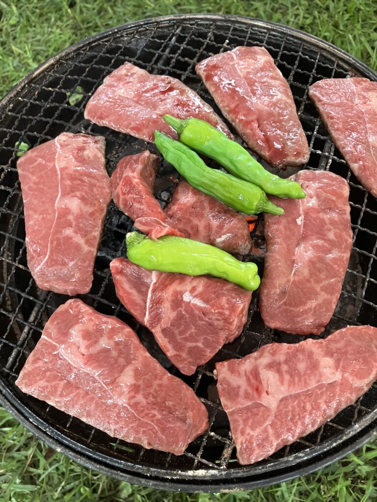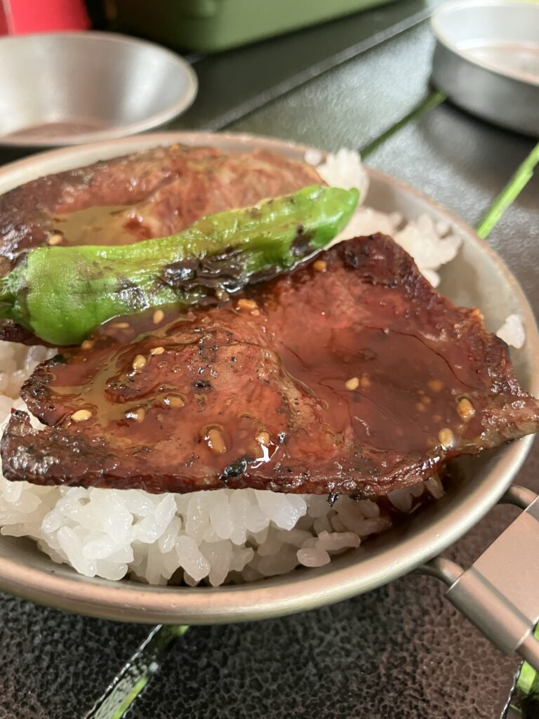 キャンプ場に到着したのがチェックインギリギリだったので、設営後は交代で温泉へ。その後、「西山精肉店」で買った牛肉で焼肉をするも、遅めのランチで食べたラーメンがお腹に残っていて、肉を消費できず。ブヨに刺されたのも苦い思い出だ。翌朝は雨。朝から焼肉の続きをして、焼肉丼を満喫した。